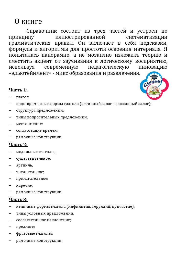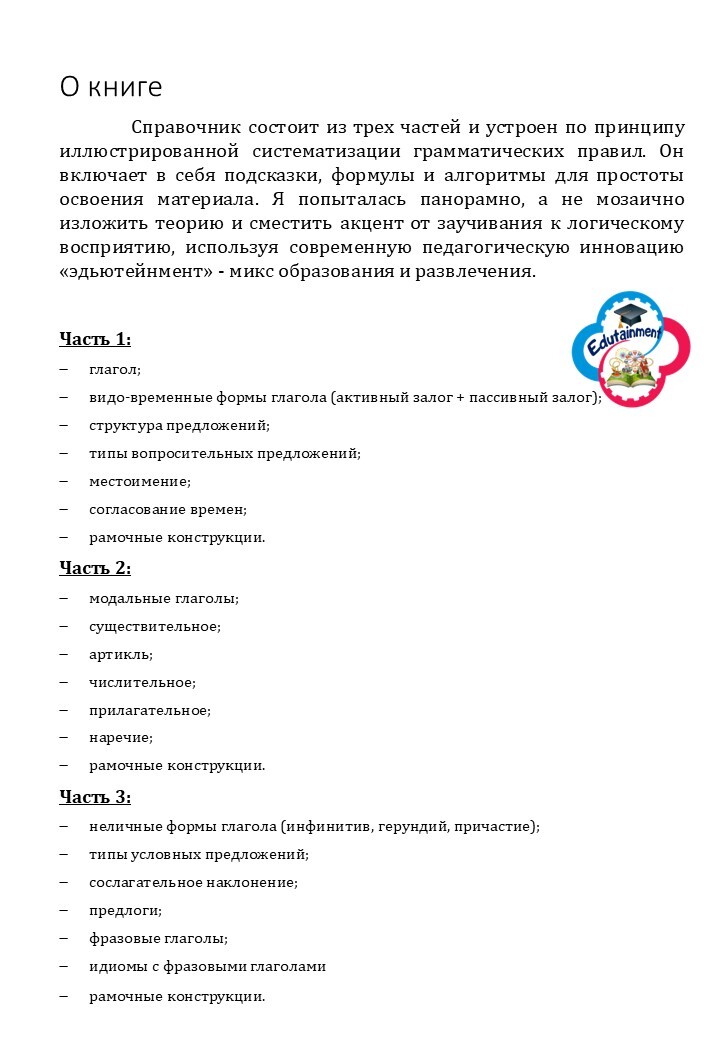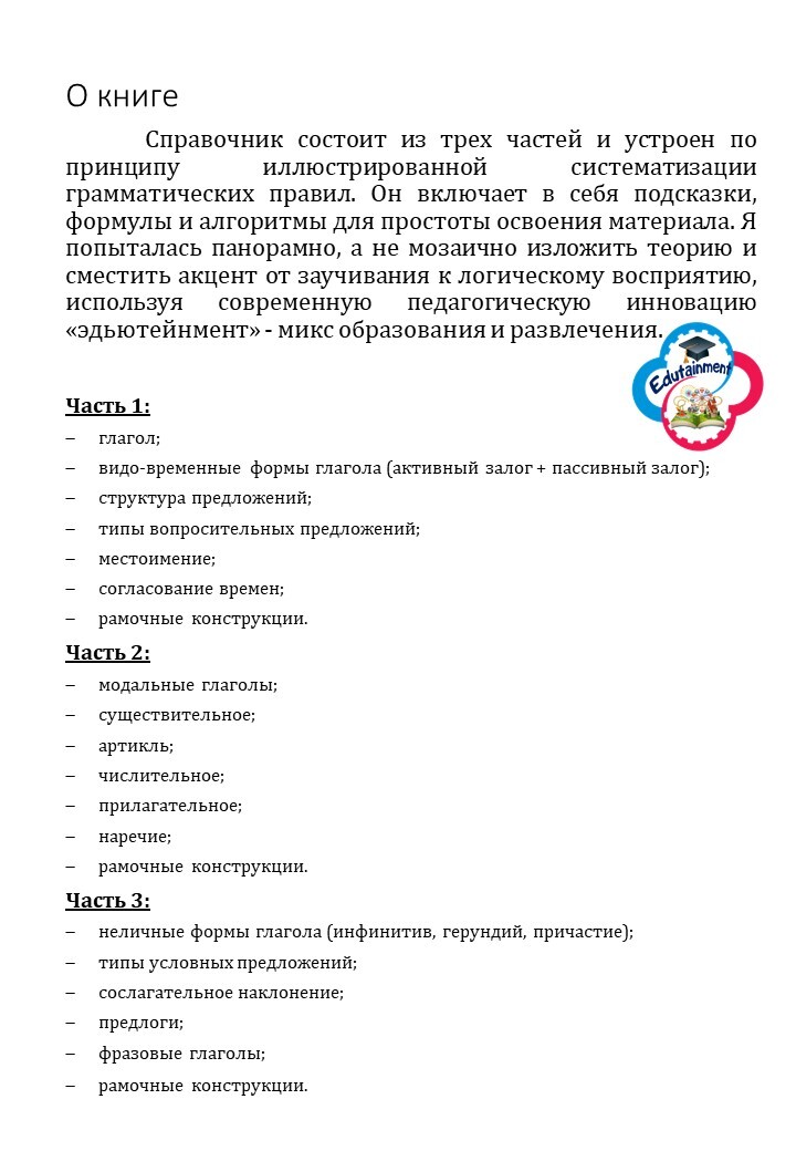 Моя книга рассчитана на широкий круг читателей. Несмотря на обилие иллюстраций и «разжеванных правил», книга будет полезна не только детям, но и всем тем, кто изучает английский язык и хочет в доступной и интересной форме получить глубокие фундаментальные знания.